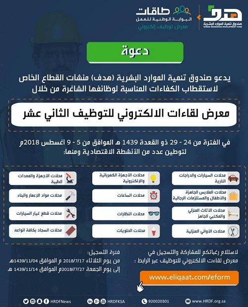 www.eliqaat.com/eform: ، علماً أن فترة التسجيل للمنشآت و تقديم الشواغر تبدأ غدا ً الثلاثاء 4 ذو القعدة 1439 الموافق 17 يوليو 2018 وحتى الجمعة 14 ذو القعدة 1439 الموافق 27 يوليو 2018.