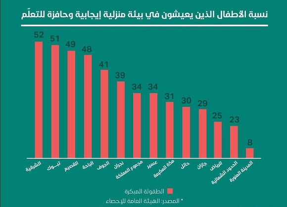 في مسحٍ أجرته الهيئة العامة للإحصاء لرصد تحقيق التنمية المستدامة، يوضّح الرسم البياني نسبة الأطفال الذين يعيشون في بيئة إيجابية ومحفّزة للتعلّم في جميع مناطق المملكة, وقد كانت النتيجة صادمة حيث جاء ترتيب منطقة الحدود الشمالية في المركز قبل الأخير بعد منطقة الرياض وبنسبة 23%