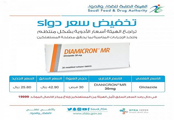 عرعر اليوم ـ سعد شافي :خفّضت الهيئة العامة للغذاء والدواء سعر دواء "Gliclazide" الذي يحمل الاسم التجاري "Diamicron"، بما يضمن توفره في السوق المحلي بأسعار عادلة ومتاحة للمريض، داعيةً المرضى إلى إبلاغ مركز الاتصال الموحد 19999 عن الأدوية التي تُباع بالسعر القديم.