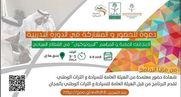 عرعر اليوم ـ منصور الدهمشي :تنفذ الهيئة العامة للسياحة والتراث الوطني بمنطقة الشمالية، ممثلة بالمركز الوطني لتنمية الموارد البشرية السياحية – تكامل دورة تدريبية بعنوان " العلاقات العامة والمراسم (البروتوكول) في القطاع السياحي، وذلك يوم الاثنين الموافق ٦/ ٨/ ٢٠١٨ في تمام الساعة ٥ الى ٩ مساءً بفندق هلان إن. "