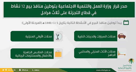 ومن المقرر أن يتم توطين منافذ البيع في أنشطة محلات الساعات، ومحلات النظارات، ومحلات الأجهزة الكهربائية والالكترونية، في تاريخ 01/03/1440هـ، بينما سيتم توطين منافذ البيع في أنشطة محلات الأجهزة والمعدات الطبية، ومحلات مواد الإعمار والبناء، ومحلات قطع غيار السيارات، ومحلات السجاد بكافة أنواعه، ومحلات الحلويات، في تاريخ 01/05/1440هـ.