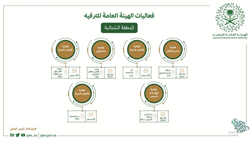 المملكة العربية السعودية، الرياض، 20 سبتمبر 2018: تستعد الهيئة العامة للترفيه لإطلاق حزمة من الفعاليات المميزة في روزنامة اليوم الوطني، احتفاء باليوم الوطني 88 للمملكة، لترسم البسمة على وجوه أهالي شمال المملكة في كل من عرعر والجوف وحائل وتبوك، حيث يشهد كل من سكان حي المساعدية بعرعر، ومنتزه السمراء بحائل، ومنتزه الأمير فهد بن سلطان في تبوك، وحي الفيصلية في الجوف، عرضاً مبهراً للألعاب النارية في اليوم الوطني 23 سبتمبر.