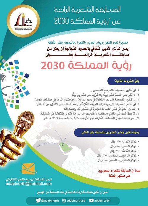 تقديرًا لدور الشعر(ديوان العرب) والشعراء بالتوعية ونشر الثقافة، يسر النادي الأدبي الثقافي بالحدود الشمالية أن يعلن عن مسابقته الشعرية الرابعة بعنوان "رؤية المملكة 2030" ، وفق الشروط التالية: