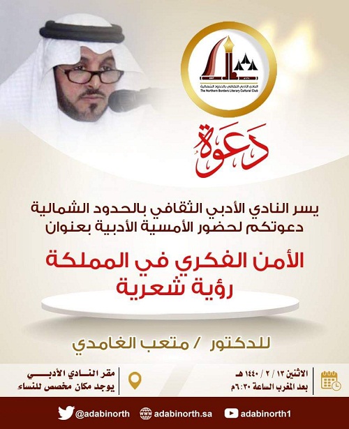 عرعر اليوم ـ رائد حمد : يسر النادي الأدبي الثقافي بالحدود الشمالية دعوتكم لحضور الأمسية الأدبية بعنوان : " الأمن الفكري في المملكة - رؤية شعرية " للدكتور متعب الغامدي - دكتوراه في الأدب السعودي شاعر وكاتب مختص في الدراسات الأمنية – وذلك يوم الاثنين 13 / 2 / 1440 هـ بعد صلاة المغرب مباشرة "6:30 م" وذلك بمقر النادي الأدبي .