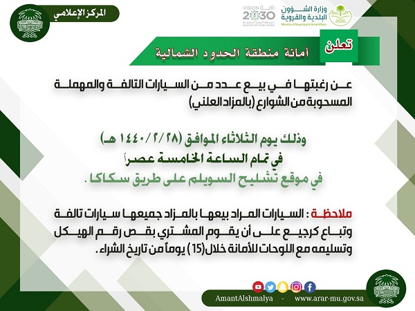 عرعر اليوم ـ رائد الدهمشي :تعلن أمانة منطقة الحدود الشمالية عن رغبتها في بيع عدد من السيارات التالفة والمهملة المسحوبة من الشوارع (بالمزاد العلني)