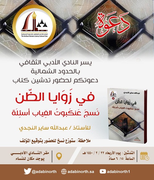 عرعر اليوم - رائد حمد :يسر النادي الأدبي الثقافي بالحدود الشمالية دعوتكم لحضور تدشين أحدث إصداراته، كتاب " في زَوَايا الظّن .. نَسجَ عَنكَبوتُ الغِياب أسئِلَة " للأستاذ عبدالله بن ساير النجدي وذلك مساء يوم الأربعاء القادم 22 / 2 / 1440 هـ الساعة "6:15 م" بمقر النادي الأدبي .وستوزع نسخ من الكتاب على الحضور بتوقيع المؤلف.