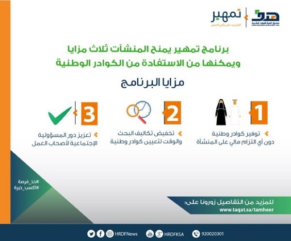 وجدد "هدف" دعوته لمنشآت القطاع الخاص إلى الانضمام لبرنامج التدريب على رأس العمل "تمهير"، وطرح فرص التدريب المتاحة لديها أمام الكوادر الوطنية، دون أي التزامات مالية أو تعاقدية عليها لصالح الصندوق، من خلال التسجيل عبر البوابة الوطنية للعمل "طاقات