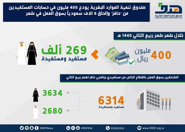 عرعر اليوم - جسار مطيران:أودع صندوق تنمية الموارد البشرية (هدف)، اليوم (الخميس)، 400 مليون ريال، في الحسابات البنكية لأكثر من 269 ألف مستفيد ومستفيدة من المسجلين في برنامجي حافز البحث عن عمل وحافز صعوبة الحصول على عمل، وذلك عن شهر ربيع الثاني المنصرم للعام 1440هـ.