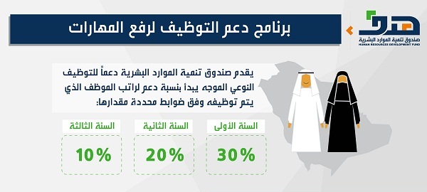 يتحمل صندوق تنمية الموارد البشرية (هدف)، ضمن برنامج (دعم التوظيف لرفع المهارات)، 30% من أجور السعوديين والسعوديات العاملين في منشآت القطاع الخاص في السنة الأولى، سعيا إلى تحفيز المنشآت على التوطين، ورفع مساهمة المواطنين والمواطنات في سوق العمل، وإكسابهم المهارات اللازمة التي يحتاجها السوق.