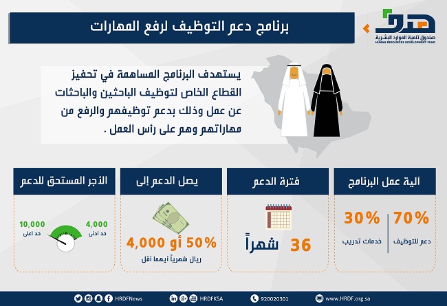 ويتحمل الصندوق من خلال البرنامج، نسبة من الأجور الشهرية للسعوديين والسعوديات العاملين لدى منشآت القطاع الخاص لمدة 36 شهرا، وذلك ضمن برنامج (دعم التوظيف لرفع المهارات)، سعيا إلى تحفيز المنشآت على التوطين، ورفع نسبة مشاركة المواطنين والمواطنات في سوق العمل، وإكسابهم المهارات اللازمة التي يحتاجها السوق وهم على رأس العمل.