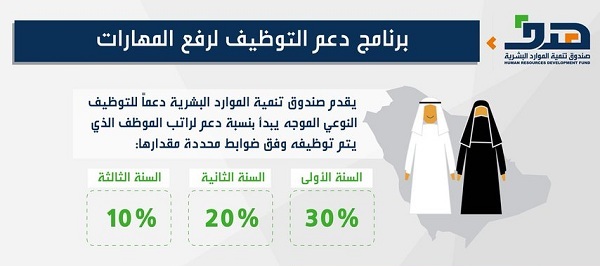 أوضح صندوق تنمية الموارد البشرية (هدف)، أن خمس فئات تستحق دعمًا إضافيًا في برنامج دعم التوظيف لرفع المهارات، بالإضافة إلى دعم البرنامج المالي الذي يمتد إلى 36 شهرًا، بمعدل 30 % من الراتب الشهري للسنة الأولى من الدعم، و 20% للسنة الثانية، و10 % للسنة الثالثة.