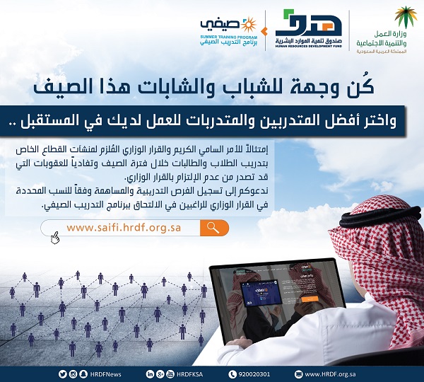 http://saifi.hrdf.org.sa، على أن يتم في خطوة لاحقة عرض الفرص التدريبية من القطاع الخاص والجهات التدريبية من خلال الموقع الإلكتروني للبرنامج، ليتمكن الطلاب والطالبات من التقديم على الفرص التدريبية، علماً أن التسجيل وعرض الفرص التدريبية في البوابة الإلكترونية للبرنامج متاح للجهات والفئات المشار إليها أعلاه خلال الفترة من 23 شعبان الجاري إلى الأول من ذو القعدة 1440 الموافق (28 أبريل 2019 ــــــ 02 يوليو 2019)، وسيتم البدء في تنفيذ البرنامج في 4 ذو الحجة 1440 الموافق لـ (07 يوليو 2019).