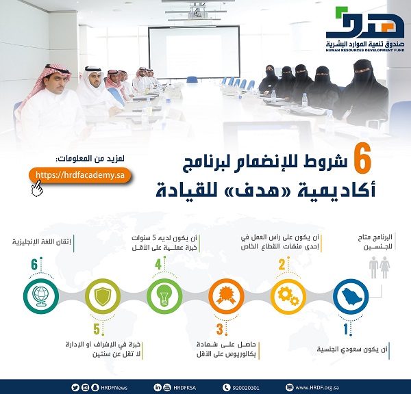 أوضح صندوق تنمية الموارد البشرية (هدف)، شروط الالتحاق في أكاديمية “هدف” للقيادة، حيث أتاح الصندوق ستة شروط للانضمام للبرنامج، الذي يهدف إلى تطوير قيادات المستقبل من منسوبي منشآت القطاع الخاص بالمملكة، دعماً للتوطين النوعي المتميز لقيادات لها القدرة على التخطيط الإبداع والابتكار.