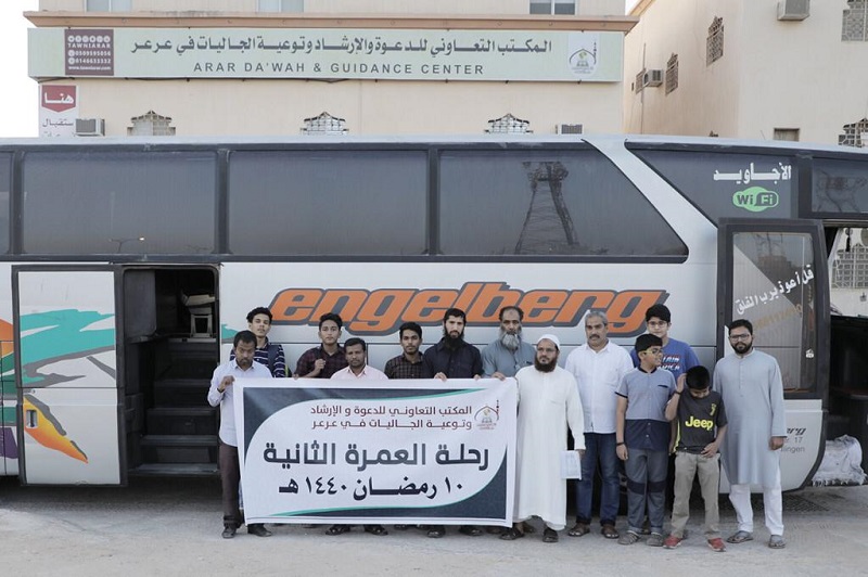 عرعر اليوم _ رائد حمد:انطلقت بفضل الله وتوفيقه صباح اليوم الأربعاء ١٠ / ٩ / ١٤٤٠هـ من مقر المكتب التعاوني للدعوة واﻹرشاد وتوعية الجاليات في عرعر الرحلة الثانية لأداء مناسك العمرة شارك فيها 44 معتمراً، وهي ضمن الرحلات التي يسيرها المكتب خلال هذا الشهر المبارك، ويرافق هذه الرحلات دعاة المكتب وذلك لشرح مناسك العمرة وإلقاء الكلمات الوعظية والدروس العلمية والمسابقات الدعوية، وتأتي هذه الرحلات بدعم كريم من شركاء المكتب من متبرعين ومحسنين سائلين الله أن يبارك في أموالهم وأعمالهم وأن يجعل ما قدموه في موازين حسناتهم.