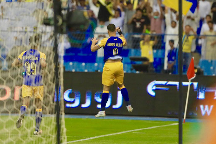 النصر تقدم في الشوط الثاني بهدف لهداف الدوري والنصر ( التاريخي ) المغربي عبدالرزاق حمدالله من ركلة جزاء عند الدقيقة 26.