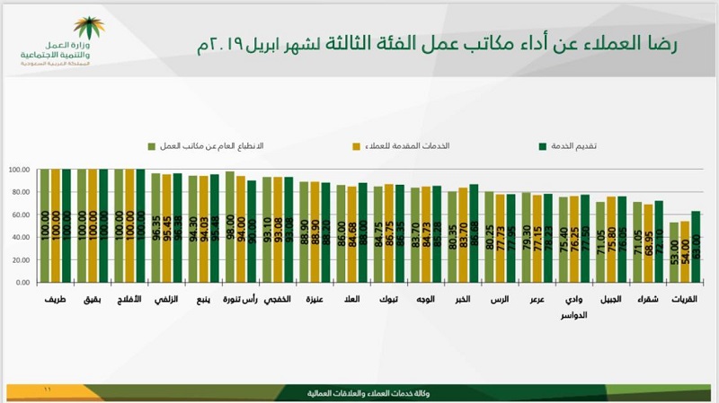 عرعر اليوم _ منصور الدهمشي :حصل مكتب العمل بطريف التابع لفرع وزارة العمل والتنمية الاجتماعية بمنطقة الحدود الشمالية , على المركز الأول على مستوى مكاتب العمل بالمملكة، في استبيان رضا العملاء عن شهر ابريل 2019م الذي تعده وكالة خدمة العملاء لقياس مدى رضا العملاء عن أداء المكاتب، بهدف تطوير الخدمات المقدمة وتحسين الجودة.