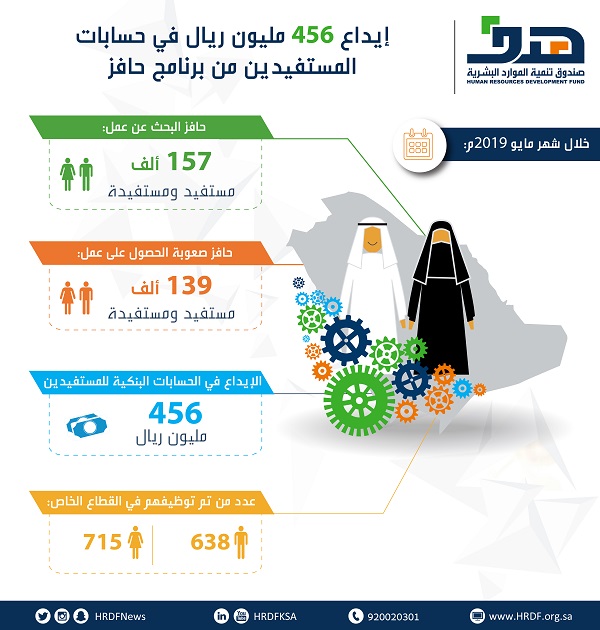 عرعر اليوم ــ جسار مطيران :يُودع صندوق تنمية الموارد البشرية "هدف"، غداً "الخميس"، أكثر من 456 مليون ريال، في الحسابات البنكية لأكثر من 297 ألف مستفيد ومستفيدة من المسجلين في برنامجَي "حافز- البحث عن عمل" و"حافز- صعوبة الحصول على عمل"، وذلك عن شهر مايو 2019م.