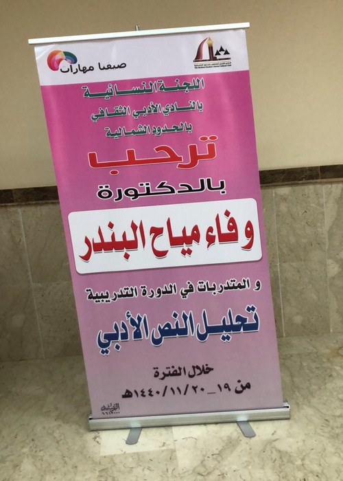 عرعر اليوم ـ نوال السويلمي :نفذت اللجنة النسائية بالنادي الأدبي الثقافي بالحدود الشمالية بعرعر يومي الأحد والاثنين 18 -19 / 11 / 1440دورة تدريبية بعنوان: "تحليل النصوص الأدبية " للدكتورة/ وفاء مياح البندر ضمن مبادرة صيفنا مهارات التي اطلقها صاحب السمو الملكي الأمير فيصل بن خالد بن سلطان بن عبدالعزيز تناولت فيها العديد من المحاور أهمها