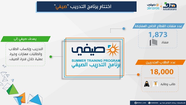 عرعر اليوم ــ جسار مطيران :أعلن صندوق تنمية الموارد البشرية (هدف)، عن اختتام البرامج التدريبية لبرنامج التدريب الصيفي (صيفي) الخميس الماضي، حيث استفاد من الفرص التدريبية للبرنامج أكثر من 18 طالب وطالبة، كما شاركت 1873 منشأة قطاع خاص بعرض أكثر من 31 ألف فرصة تدريبية أمام الطلاب والطالبات.