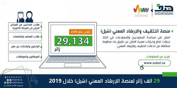 أوضح صندوق تنمية الموارد البشرية "هدف" أن 29,134 مستخدماً زاروا منصة التثقيف والإرشاد المهني "سُبل" منذ بداية العام الجاري 2019م ،وحتى نهاية أغسطس الماضي، حيث تعمل المنصة على مساعدة السعوديين والسعوديات في اتخاذ خيارات تعلم وخيارات مهنية أفضل عن طريق بناء منظومة متكاملة من خدمات التثقيف والإرشاد المهني.
