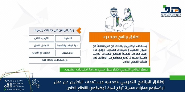 عرعر اليوم _ منصور الدهمشي :أعلن صندوق تنمية الموارد البشرية (هدف)، عن إطلاق برنامج "جدير"، الذي يستهدف تدريب الباحثين والباحثات عن عمل انطلاقا من الميول المهنية واحتياجات المتدرب، ووفق مدة زمنية محددة، تمهيدًا لمنحهم شهادات تدريب واجتياز معتمدة، تدعم فرص حصولهم على الوظائف لدى منشآت القطاع الخاص.