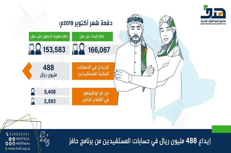 عرعر اليوم ـ رائد حمد :أودع صندوق تنمية الموارد البشرية (هدف)، اليوم (الثلاثاء)، أكثر من 488 مليون ريال، في الحسابات البنكية لأكثر من 319 ألف مستفيد ومستفيدة من المسجلين في برنامجي حافز البحث عن عمل وحافز صعوبة الحصول على عمل، وذلك عن شهر أكتوبر 2019م.