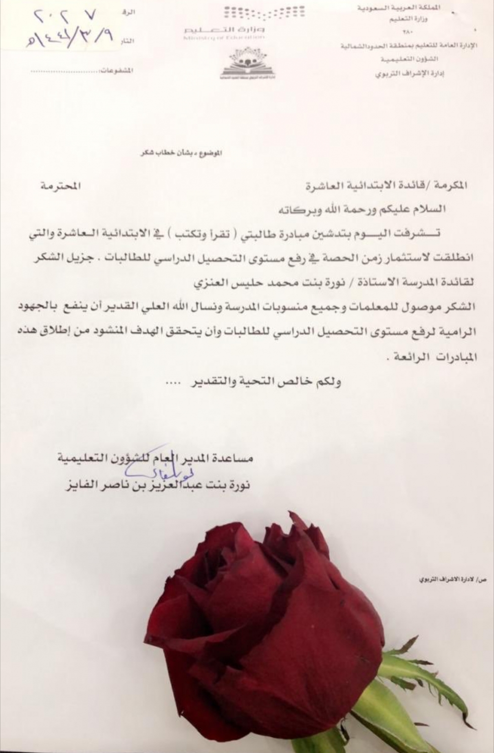 11-08-2019 06:26 PM عرعر اليوم : تلقت قائدة الإبتدائية العاشرة بعرعر الأستاذة : نورة بنت محمد حليس خطاب شكر من مساعدة المدير العام للشؤون التعليمية بتعليم الحدود الشمالية سعادة الأستاذة : نورة بنت عبدالعزيز الفايز بعد تدشين مبادرة طالبتي( تقرأ وتكتب ) بالابتدائية العاشرة والتي انطلقت لاستثمار زمن الحصة في رفع مستوى التحصيل الدراسي للطالبات .
