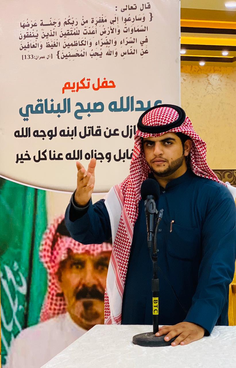 وقلد الاعلامي مشعل الهويدي المواطن عبدالله بن صبح البناقي وسام على موقفه الإنساني و النبيل في العفو عن قاتل ابنه.