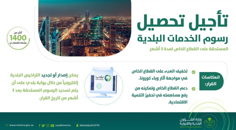 أجلت وزارة الشؤون البلدية والقروية تحصيل رسوم خدماتها على القطاع الخاص لـمدة 3 أشهر لأكثر من 1400 نشاط اقتصادي, وذلك في ظل اهتمام حكومة خادم الحرمين الشريفين وتخفيفاً على القطاع الخاص من آثار فيروس كورونا المستجد, حيث يمكن الآن للقطاع الخاص الاستفادة من إصدار أو تجديد التراخيص البلدية إلكترونياً من خلال بوابة بلدي ، على أن يتم تسديد الرسوم المستحقة للرخص بعد 3 أشهر من تاريخ الأمر.