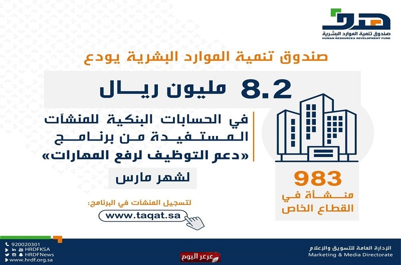 أودع صندوق تنمية الموارد البشرية (هدف) 8.2 مليون ريال في الحسابات البنكية لـ 983 منشأة في القطاع خاص، تمثل نسبة الدعم المالي لشهر مارس للمنشآت المستفيدة من برنامج دعم التوظيف لرفع المهارات؛ حيث يتحمل البرنامج نسبة من أجور السعوديين والسعوديات العاملين في القطاع الخاص، بعد تسجيلهم في البرنامج.