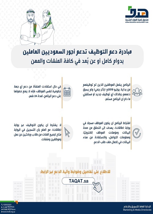 وتستطيع المنشآت التسجيل إلكترونيًا والاستفادة من المبادرة، من خلال الدخول إلى صفحة المبادرة على البوابة الوطنية للعمل (طاقات) عبر الرابط: