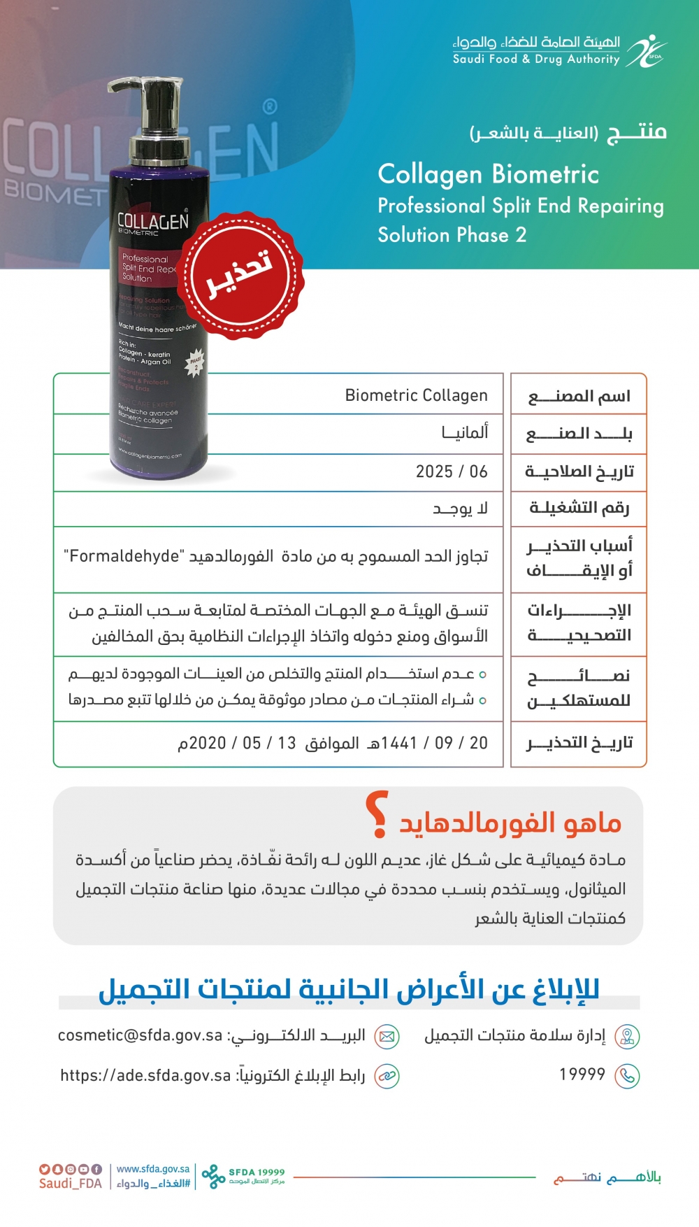 05-14-2020 03:07 PM عرعر اليوم :حذرت الهيئة العامة للغذاء والدواء من تداول واستعمال منتجين للعناية بالشعر، لاحتوائهما نسبة عالية من مادة "الفورمالدهايد"، تُجاوز الحد المسموح به في لائحة متطلبات السلامة في مستحضرات التجميل والعناية الشخصية.