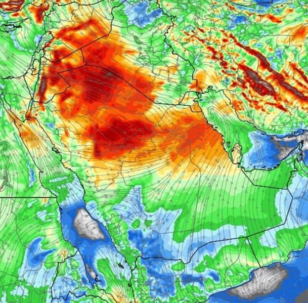 وأضافت أنه يتوقع أن تتأثر لاحقاً بعض الدول المجاورة للمملكة بحالة "حمراء"، ومنها الكويت، والأردن، والعراق، متوقعة أن تؤثر هذه الحالة لاحقاً على بقية دول الخليج، إضافة لجنوب المملكة واليمن. 0