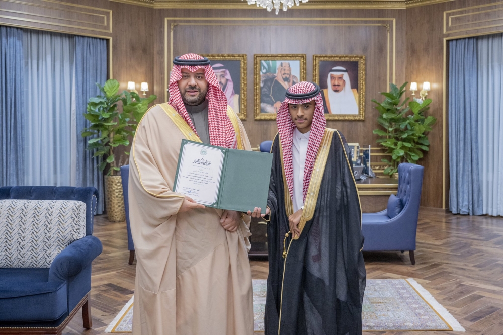 كرم صاحب السمو الملكي الأمير فيصل بن خالد بن سلطان بن عبدالعزيز أمير منطقة الحدود الشمالية الرئيس الفخري لجمعية "مثاني لتحفيظ القرآن الكريم بالمنطقة" في مكتبه اليوم, الطالب فهد بن عادل العنزي ,أحد طلاب الجمعية الفائز بالمركز الثاني بالفرع السادس على مستوى المملكة بمسابقة خادم الحرمين الشريفين لحفظ القرآن الكريم وتلاوته وتفسيره.