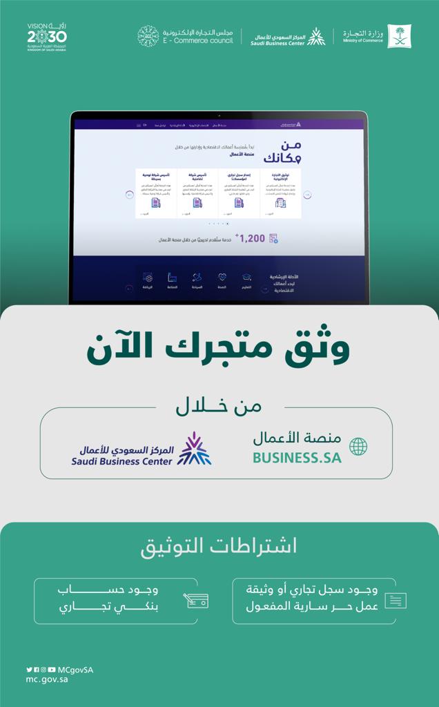 وأوضحت الوزارة أن إجراءات التوثيق سهلة وميسرة وتتم بشكل إلكتروني عبر: https://business.sa ويشترط للحصول على التوثيق: وجود سجل تجاري أو وثيقة عمل حر سارية المفعول، ووجود حساب بنكي تجاري. 0