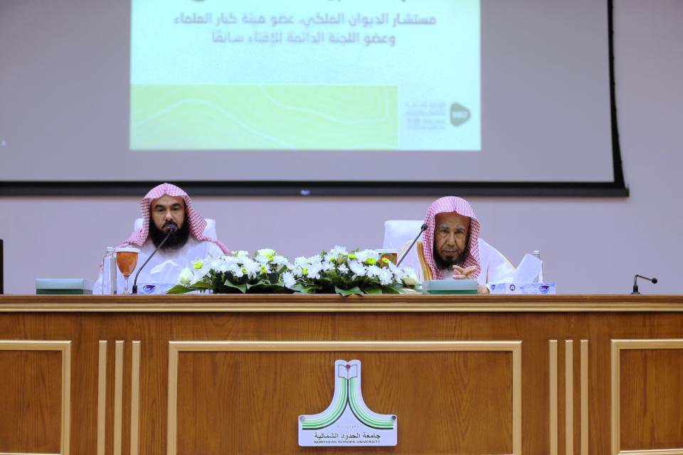 بعد ذلك اصطحب رئيس الجامعة معالي الشيخ الدكتور المطلق إلى مسرح كلية العلوم الإنسانية والاجتماعية، حيث ألقى الدكتور المطلق محاضرة عن أهمية الأمن الفكري تطرق فيها حول توازن الشخصية الإسلامية ووسطيتها، ومدى أثر المسلم في الحياة الدنيا وما ينتظره في الآخرة، ومنوهًا بما يمثله المسلم في هذه الحياة من قيادة وتُوازِن بين الدنيا والآخرة. مبينًا أنه لا يؤخذ العلم إلا من مصادره الصحيحة، وليس من خلال المواقع غير الموثوقة أو الاستماع للمضللين و أنصاف المتعلمين وأن العلماء في المملكة العربية السعودية هم محط فخر واعتزاز وثقة على الصعيد المحلي وحتى خارج المملكة، كما حث معاليه على الالتزام بما يقدموه لنا من توجيهات وآراء في أمور ديننا ودنيانا. مضيفًا ما للصحبة الطيبة من أثر إيجابي في حياة الطالب.
